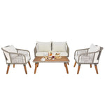 Transform your outdoor living space into a stylish and comfortable retreat with our 4 Piece Acacia Wood Patio Conversation Set. This sofa set, crafted from premium acacia wood and featuring an eye-catching rope design, includes a loveseat, two cushioned chairs, and a coffee table. Perfect for lounging by the poolside, relaxing on the balcony, or hosting garden gatherings, this modern deep seating set combines durability, comfort, and contemporary style.