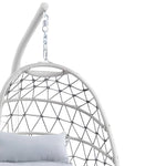 • Sturdy and Durable Design: This hanging chair with stand features a metal frame with a sleek beige spray-coated finish, reinforced by sturdy rattan wrapping, ensuring it remains deformation-resistant. With its triangular base, the chair can support up to 350 pounds, providing a stable and secure seating experience.